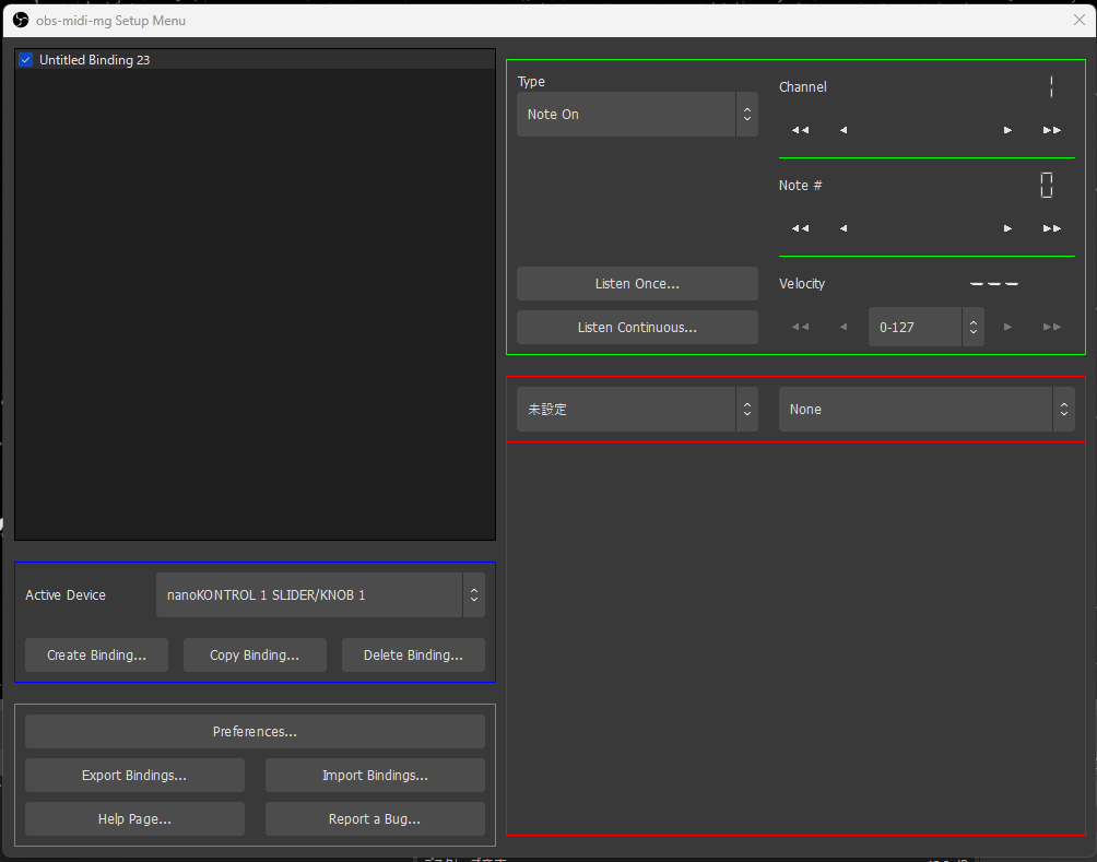 緑枠の「Listen Once…」をクリック後、nanoKONTROLの「▶」を押すと