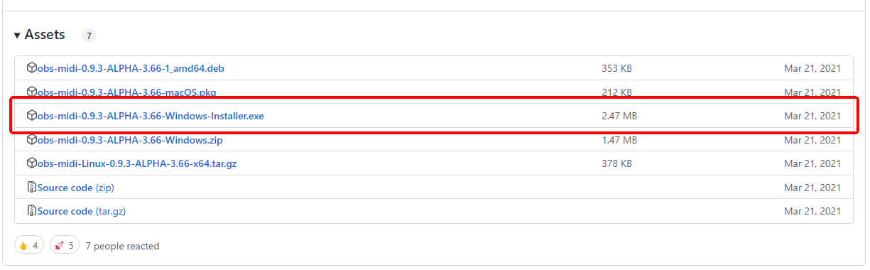 GitHubの詳細ページに遷移するのでページ下部のリンクから使用しているOSのバージョンをダウンロードする。私は面倒くさがりなので「obs-midi-0.9.3-ALPHA-3.66-Windows-Installer.exe」をチョイス。