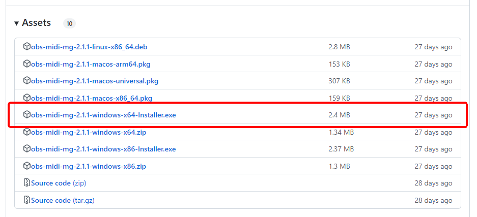 今回は「obs-midi-mg-2.1.1-windows-x64-Installer.exe」をダウンロード。