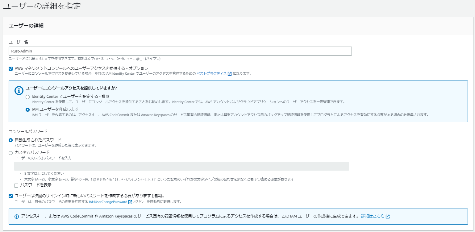 「AWSマネジメントコンソールへのユーザーアクセスを提供する」はチェックをオンにして、「IAMユーザーを作成します」を選択します。