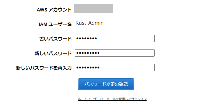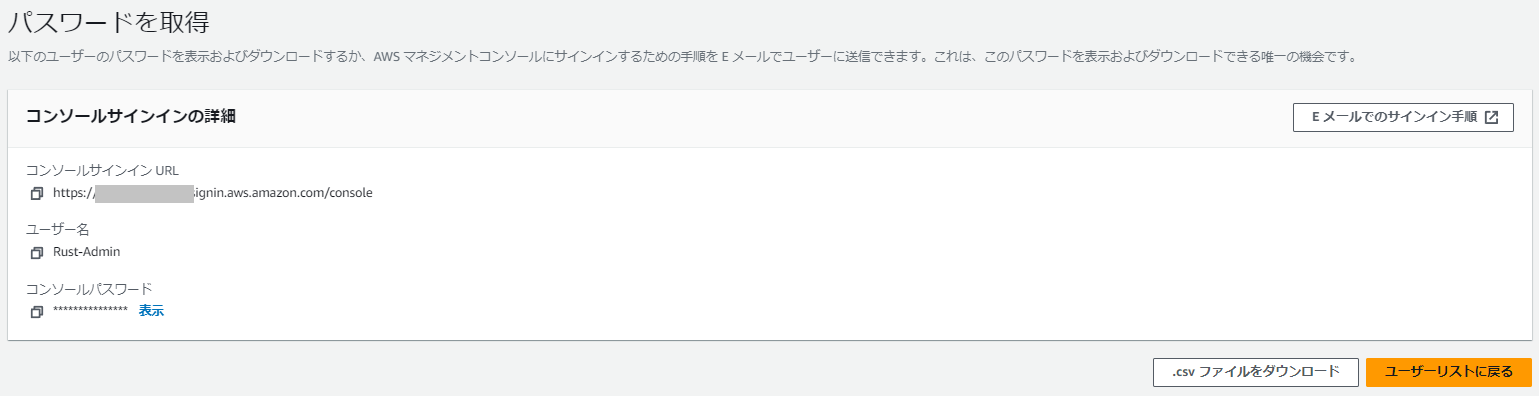 ルートユーザーを一旦サインアウトして、先程ダウンロードしたcsvファイルに記載されているコンソールサインインURLにアクセスします。