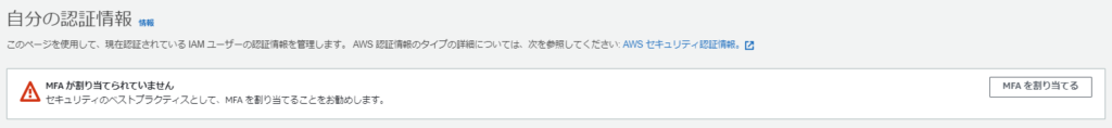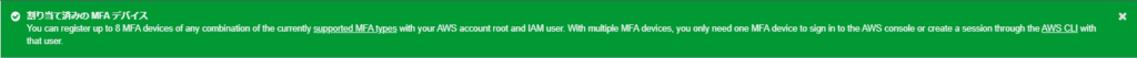 結構忘れがちですが重要な設定になります。今回作成したIAMユーザーは管理者権限が許可されているので万が一、ユーザー情報が漏洩した場合にも多要素認証できなければログインできないので安心です。