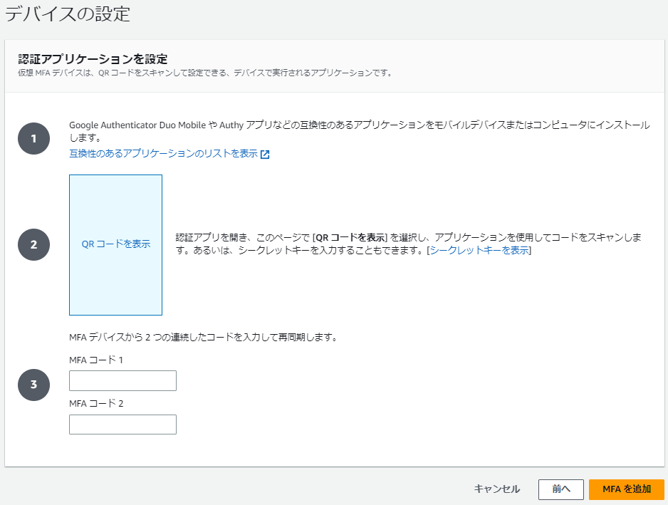 「QRコードを表示」をクリックするとQRコードが表示されるので、スマホの認証アプリでスキャンしてアカウントを登録してコードを2回入力後、「MFAを追加」をクリックします。