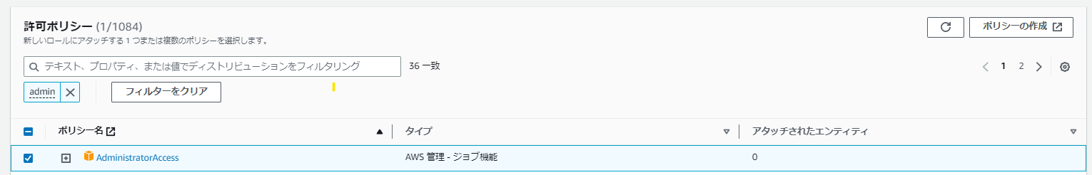 テキストボックスに「AdministratorAccess」を入力して、フィルタリングします。