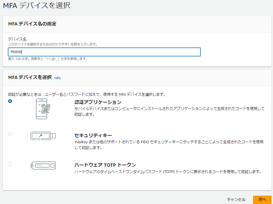 デバイス名を「Mobile」としていますが、分かりやすい名前で問題ないです。認証アプリケーションを選択して「次へ」をクリックします。