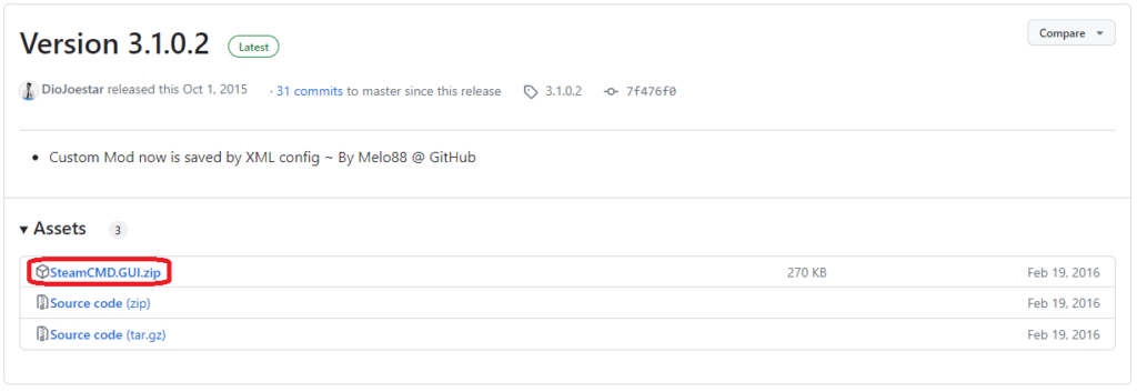 ダウンロードページに飛ぶので「SteamCMD.GUI.zip」をクリックすると、ダウンロードされます。